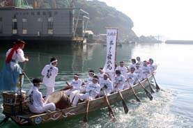 白いユニホームを着た一行は午前8時すぎ、天満港(木江)近くの桟橋を出発。