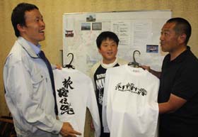 【写真説明】そろいのユニホームを手に宮島を目指す思いを語り合う左から、藤原会長、最年少参加の藤原崚君、野村さん