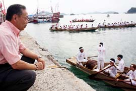 【写真説明】櫂伝馬競漕を初めて観戦し、島の若者への感動を新たにする井上さん(8月、大崎上島町東野)